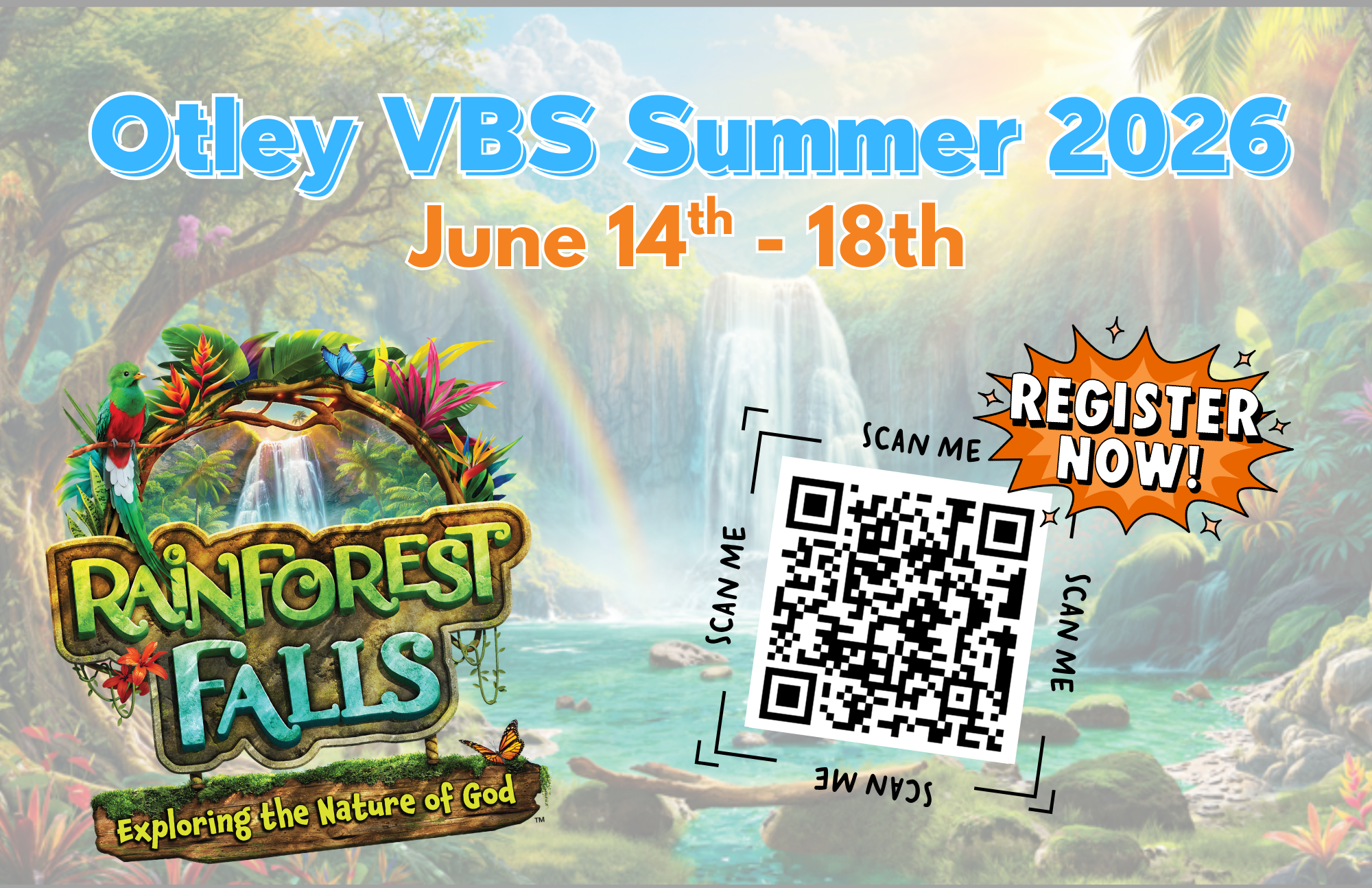Join us at Otley Church for an exciting week of Vacation Bible School as we head deep into Rainforest Falls! Kids will trek through the rainforest, discover God’s amazing love, and learn how to follow Jesus in every part of life. Each evening will be filled with high-energy music, engaging Bible stories, fun games, tasty treats and growing in faith.